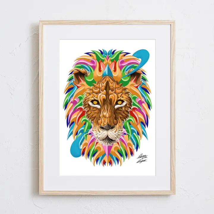 アーティスト -PROFILE- Madblast Hiro(ヒロ) 岐阜県出身。ライブペインター / アーティスト 2021年には大阪府の貝掛中学校の皆様と長さ230mの壁画を制作。 岐阜駅前の繊維問屋街では高さ16mの壁画を制作の他、G-SHOCKやSONY、BETONES等に作品提供を行う。 独自の模様をブロックのように積み上げる表現を突き詰める。 【作品について】 カラフルな色使いはMadblast Hiroの得意とする表現方法の一つ。 迫力あるライオンは今にも飛び出してきそうな、躍動感を感じます。 作品名:Mad Lion 手法:イラスト、デジタル ペーパー:高品質半光沢紙 マットカラー:白 マット*:DXホワイト芯 100%バージンパルプ/PH7・中性紙(2mm厚) ※全てのアートにマットがつきます フレームカラー:黒、白、無垢(3種類から選択) ※マット付のため通常とはフレームサイズが異なる規格となります。 【マット*とは?】 アートポスターの周りに挟んだ厚紙の事。 マットを使わない時に比べ余白により広がりが生まれ、作品の新たな一面を引き出せ作品の見栄えがグッと良くなります。また、額縁のガラス面と作品が直接触れたままにしておくと、くっついて作品を傷つけることがあります。マットを使用することでガラスと作品の間に空間ができ、作品を保護することができます。ブランドコンセプトにより全てのアートにマットがつきます。 ー ファッションのようにアートを ー 私達が掲げるコンセプトです! 毎日着替えるファッションの様に、アートも気軽に飾り変えて欲しい... 一旦飾り終えたアートにも光を当ててほしい... ポスター単体、またはリピートで中身だけのポスターを購入された方に"専用のハンガー"をセットでお届け。 「今までに無い!新しいアートの飾り方を提案」 飾る事がなくなった前のアートをハンガーにかけて洋服と一緒にかけてもらう。 その日の気分や、モチベーションですぐに取り換えられる様に。 もちろん、魅せる収納としても今までにないおすすめの飾り方です。