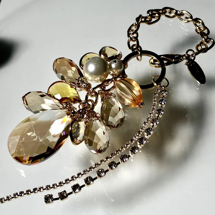重厚なガラスとメタルを用い、静かな輝きと品格を纏うアクセサリー。日常にも特別な場にも寄り添う、大人のためのチャームブランド。