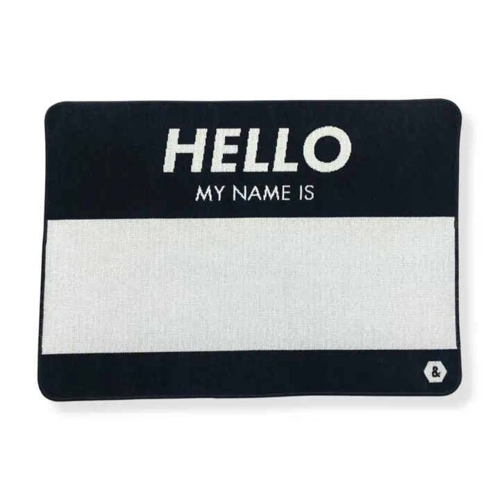 HELLO MY NAME ISステッカーを模したラグマットです。 もともとは、海外のパーティなどで名札の代わりに使われるステッカーのデザインです。アメリカなどではスーパーや雑貨店などで販売されているポピュラーなものなんです。 一方でこのステッカーは、ストリートでのグラフィティアートやタギングなんかの文字を描いて電柱や看板なんかにベタベタ貼ってあるのを見かけたりするほど、 ストリートカルチャーの中で使用される定番デザインとしても定着しています。 思い切って、スプレー缶なんかで自分の名前とか書いちゃっても良いかもですねー。 Sizes:w700×d500mm Quality:Polyester Price:3,800JPY(w/o tax)