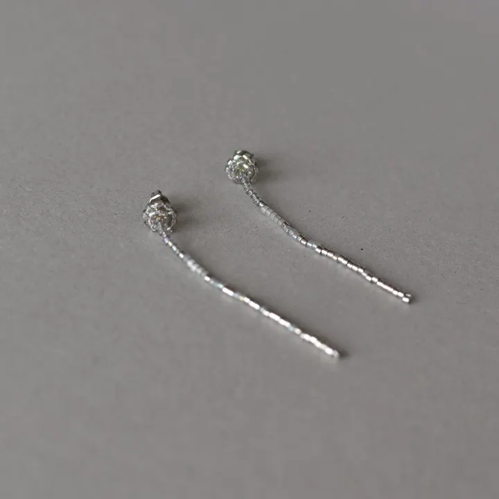 細くて長くて糸のようになっているもの 円柱状のガラスビーズを一本に紡ぎ合わせました 物体の美しさに手を加えすぎないように慎重に material SV925(ピアス金具)、ガラスビーズ、銀糸、真鍮、チタン、フェルト、本革 *シルバービーズはパラジウムッキ加工を施したものを使用しております size 約53mm weight 約0.52g *取り付ける金具によって、重さが異なります *CACICOの商品は全て1点1点制作しているため、個体差があり、商品写真と差がある場合がございます。ご了承の上、ご購入ください。 *金属アレルギーの方はご使用をお控えください *受注生産のため、ご注文確定後1週間〜10日以内に商品を発送いたします