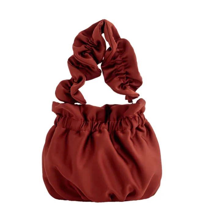 特別な日が常に晴れますように。 幸せなハレの日が続きますように。 幸せを祈る気持ちを込めたオケージョンラインです。 サテンのギャザーハンドルが手元を美しく見せるラウンドバッグ。 開口部はギャザーゴム仕様で中身の出し入れも簡単、クラッチバッグとして持っても素敵です。 ギャザーハンドルを肩当てとし付属のチェーンを繋げれば、ショルダーバッグとしても使える2way仕様です。 お呼ばれのパーティーシーンでは、刺繍のドレスなど繊細な生地のお洋服の場合があるので生地に触れる肩部分はハンドルを当てるような工夫をしています。 ベーシックな3色に加え、パッと目を惹く深みのあるオレンジはコーディネートの差し色としてgoodです。