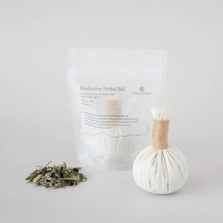 *メディテーションハーブボール 新月 NEW MOON* ―月のリズムにあわせて 自然と繋がる、私と繋がる― メディテーションハーブボールは、忙しい毎日の中で、自分に意識を向ける時間が取りづらいという方に、自分と対話し、自分と向き合う習慣を大切にしてほしいという想いを込めて作りました。新月と満月のテーマでブレンドした神聖なハーブボールの香りと温かさに包まれて、深呼吸とともに、自分の内側へと深く繋がっていきます。メディテーションハーブボールは、本当の自分を生きる喜びを取り戻し、豊かで幸せな人生を送りたいと願うあなたをサポートします。 【商品説明】 <新月> 世界各地で浄化や禊の儀式に欠かせないハーブ、神社・仏閣で使用される神聖なハーブを中心にブレンド。凛とした香りを纏い、心と体を清めてリセットし、本来の自分の感覚を呼び覚まします。内側から溢れるエネルギーと共に、新しいスタートを。 *ハーブボールとは? 何種類ものハーブを布に包み、温かく蒸したものを全身に押し当てるトリートメントです。ハーブの香りに包まれ、全身を芯から温めてくれる「ハーブのお灸」と言われています。タイやインドなどのアジア諸国を中心に、昔から伝統医療の一つとして治療で使われており、現在も病院で薬として提供されています。ハーブボールの柔らかさと温かさ、そして香りは心と体を芯まで温め、深いリラックスへと導くと言われています。