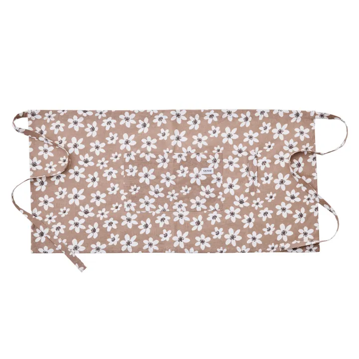 清楚な白い花が全体に広がるエプロン。 ブルーは爽やかで軽やかな印象、ベージュは温かみとナチュラルな雰囲気を演出。 季節を問わず、日常を明るく華やかにしてくれる一枚です。 ●POINT 【気軽に着用しやすい腰巻タイプ】 短めの丈で動きやすい腰巻タイプのエプロンです。 【大きめなフロントポケット】 大きめなフロントポケット付き。 センターで分かれているので、メモやレシピなどを仕分けて入れることができます。 【クロスかけ紐】 キッチンで作業する際に便利なクロスかけ紐。 キッチンクロスやタオルなどをかけておくと便利です。