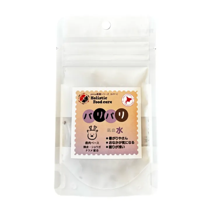 高品質な人も食べられる基準の素材の中から厳選した食材から作ったジャーキーです。 北海道の猟師さんから仕入れる新鮮なエゾシカを使用しています。 【Point1】氣血水理論に基づいたラインナップ 薬膳の基本である「氣」「血」「水」の巡りに着目し、3つのバランスを整えることを目指した商品です。 氣・血・水のいずれかが不足したり滞ったりすると、からだのリズムが乱れやすくなると考えられており、その考え方をごはんに応用しています。 【Point2】お腹のゆるさや、水分を多くとりがちな子に ちょっとした不調は、食事の中で氣血水のバランスを整えることでサポートできる場合があります。 お腹がゆるくなりやすい、飲水量が多い、暑がり、夜に落ち着きづらいなど、日々の体調面でお悩みの飼い主さまにも選んでいただきやすい商品です。