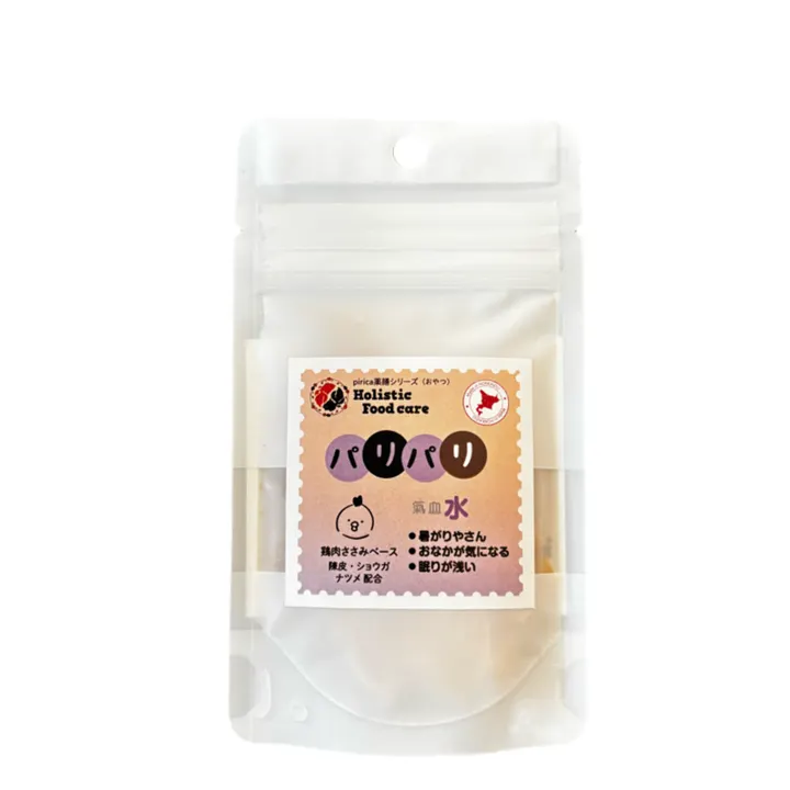 北海道・中札内でヨモギなどの漢方に用いられる食材を食べて育った中札内地鶏を使用しており、地元の方にも長く愛されている希少価値の高い鶏肉を使用。 高品質な人も食べられる基準の素材の中から厳選した食材から作ったジャーキーです。 【Point1】氣血水理論に基づいたラインナップ 薬膳の基本である「氣」「血」「水」の巡りに着目し、3つのバランスを整えることを目指した商品です。 氣・血・水のいずれかが不足したり滞ったりすると、からだのリズムが乱れやすくなると考えられており、その考え方をごはんに応用しています。 【Point2】お腹のゆるさや、水分を多くとりがちな子に ちょっとした不調は、食事の中で氣血水のバランスを整えることでサポートできる場合があります。 お腹がゆるくなりやすい、飲水量が多い、暑がり、夜に落ち着きづらいなど、日々の体調面でお悩みの飼い主さまにも選んでいただきやすい商品です。