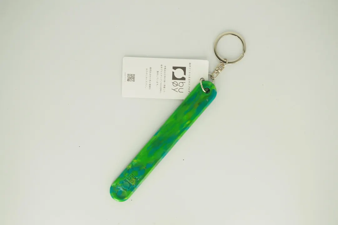 幾何形体モチーフのシンプルなキーホルダーです。 表面にはbuoyのロゴ、裏面にはSDGsの目標キャッチコピー「LIFE BELOW WATER(海の豊かさを守ろう)」が刻印されています。 buoyの製品は全て日本各地で回収された海洋プラスチックごみを材料に作っています。着色などの加工を加えず、偶然海岸に漂着した色味でできています。 明るい発色が特徴のプラスチックですが、複数の色が交じり合うことでちょっと有機的なモザイク模様が特徴です。 製品にはひとつひとつゴミの漂着地域が明記されています。日本で起きている海洋ごみの問題をリアルに感じることができます。 また、商品に添付されているQRコードを読み込むとそれぞれの回収を行ったビーチクリーン団体さんの情報を見ることができます。 ------------------------------------------------------------------- 海洋プラスチックごみを材料に変える独自技術buoyの特徴 (buoyは海洋プラスチックごみ素材使用を前提にした株式会社テクノラボの独自技術により成形しています。株式会社テクノラボは本技術において特許取得済み) ◆材料を分けないで成形するため生まれる独自の模様 材料はすべて着色せず海洋ごみの色を活かして成形しています。偶然生まれる色と模様は回収された漂着ごみによって決まります。 ◆製品の重さが海洋ごみの重さ 製品をコーティングしているフィルム以外、混ぜ物などせず海洋ごみでできているので製品の重みから海洋ごみ問題を感じられます。 ◆製品にすべて材料の漂着地を明記 buoyは日本各地のビーチクリーンボランティアや企業の方から材料を提供していただいています。これらの材料は時期と地域を分けて管理され、製品にはすべて材料産地のシールを貼り販売しています。 buoyの材料産地をきっかけに回収された地域のことを知ってほしいとの思いからbuoyでは団体様の紹介ページを作成しています。 http://www.techno-labo.com/rebirth/partner/ -------------------------------------------------------------------