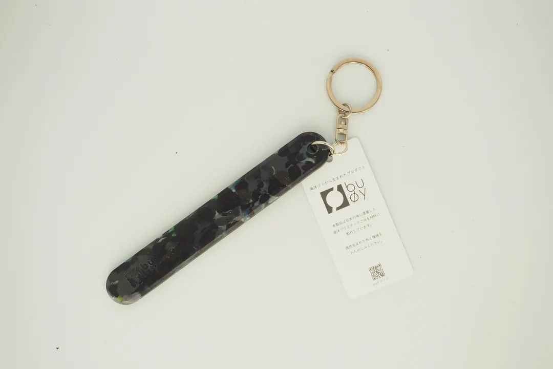 幾何形体モチーフのシンプルなキーホルダーです。 表面にはbuoyのロゴ、裏面にはSDGsの目標キャッチコピー「LIFE BELOW WATER(海の豊かさを守ろう)」が刻印されています。 buoyの製品は全て日本各地で回収された海洋プラスチックごみを材料に作っています。着色などの加工を加えず、偶然海岸に漂着した色味でできています。 明るい発色が特徴のプラスチックですが、複数の色が交じり合うことでちょっと有機的なモザイク模様が特徴です。 製品にはひとつひとつゴミの漂着地域が明記されています。日本で起きている海洋ごみの問題をリアルに感じることができます。 また、商品に添付されているQRコードを読み込むとそれぞれの回収を行ったビーチクリーン団体さんの情報を見ることができます。 ------------------------------------------------------------------- 海洋プラスチックごみを材料に変える独自技術buoyの特徴 (buoyは海洋プラスチックごみ素材使用を前提にした株式会社テクノラボの独自技術により成形しています。株式会社テクノラボは本技術において特許取得済み) ◆材料を分けないで成形するため生まれる独自の模様 材料はすべて着色せず海洋ごみの色を活かして成形しています。偶然生まれる色と模様は回収された漂着ごみによって決まります。 ◆製品の重さが海洋ごみの重さ 製品をコーティングしているフィルム以外、混ぜ物などせず海洋ごみでできているので製品の重みから海洋ごみ問題を感じられます。 ◆製品にすべて材料の漂着地を明記 buoyは日本各地のビーチクリーンボランティアや企業の方から材料を提供していただいています。これらの材料は時期と地域を分けて管理され、製品にはすべて材料産地のシールを貼り販売しています。 buoyの材料産地をきっかけに回収された地域のことを知ってほしいとの思いからbuoyでは団体様の紹介ページを作成しています。 http://www.techno-labo.com/rebirth/partner/ -------------------------------------------------------------------