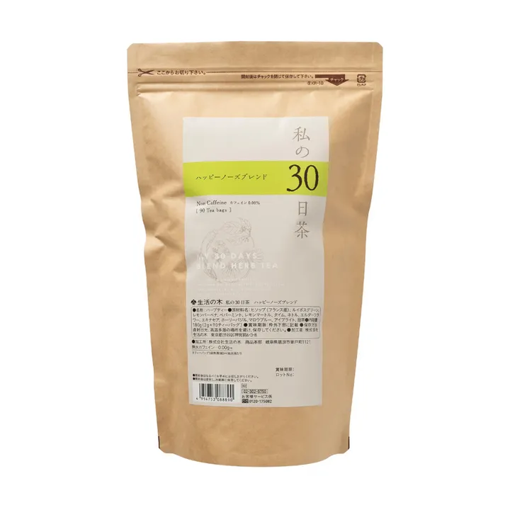 心と体に気持ち良い習慣を始めていただくための「私の30日茶」です。 日々の生活の中で無理なく、美味しく、楽しみながら飲み続けられるよう、とにかく美味しさにこだわりました。 ゴクゴク飲めて、身体に染みわたるようなブレンドに仕上げています。 ハッピーノーズブレンドは、ヒソップやネトル、エルダーフラワーや甜茶など13種類のハーブを配合しました。 清涼感を感じるヒソップをベースに、ハーバルシトラス調の風味が特徴です。 【7ティーバッグ】 1週間のお試し用に。 袋のトップに穴があいておりフック陳列が可能。 個包装タイプではありません。 【30ティーバッグ】 まずは30日召し上がっていただくために。 携帯に便利な個包装タイプなので、オフィスや旅行先への持ち運びにも。 【90ティーバッグ】 しっかり3ヶ月間継続的に飲用していただくために。 1日に数回召し上がる方や、家族やオフィスのみんなで飲む場合にも便利です。 個包装タイプではありません。