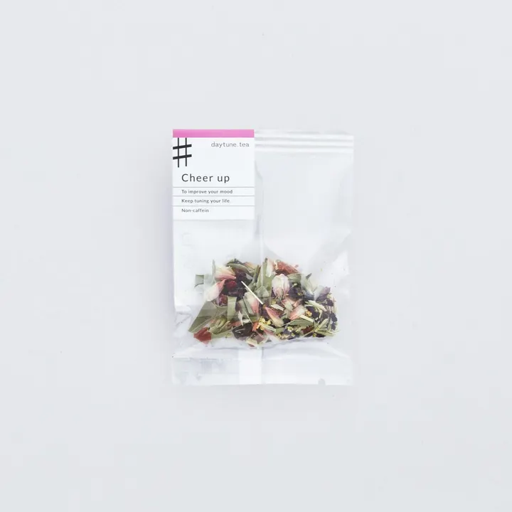 ※ティーバッグ30個をジップ付きのアルミ袋に入れてお届けします。 身体を温めるマスカットのような香りのエルダーフラワーに、ビタミン補給の定番の組み合わせであるハイビスカスとローズヒップをブレンドしました。すっきりとした甘酸っぱさと、月桃のオリエンタルな爽やかさが、あなたにそっと寄り添うハーブティーです。 ・前向きになるためのブレンド Cheer upブレンドは、あなたを前向きに元気づける、フルーティーなピンク色のティー。ストレスでお悩みの方におすすめとされる、ビタミンB群、Ca、鉄分が豊富なグリーンオートを起点に、マスカットのフルーティーな香りがするエルダーフラワーと甘酸っぱいローズヒップを絶妙なバランスでブレンド。 アクセントとして、ハイビスカスの酸味もプラスし、月桃がほんのりスパイシーな甘さを加えています。見た目でも元気になるように、千日紅でピンクの彩りも添えました。甘酸っぱくフルーティーな味わいをお楽しみください。 ・素材へのこだわり アクセントとしてスパイシーな甘さを加える月桃は、雑味なく香りの立つ国産のものを使用。そのなかでも、ふわっと香りが広がる葉が大きいものを厳選しています。 ピンクの彩りとして綺麗な千日紅は、低温でゆっくり時間をかけてドライをさせることで、色も形も生き生きとした新鮮味が感じられる国産のものを使用。 ・リフレッシュしたい時に 好きなことのはずなのに、どうして仕事が進まないんだろう。さっき、どうしてあんな言い方をしてしまったんだろう…。そんなマイナスな感情を引きずってしまうと、手が止まり、負のループに陥って抜け出せなくなったりする。 そんな時には、「今」にもっと目を向けて、無理矢理にでも一区切りつけてみる。過去は過去。今からまた始めれば、それでいい。そう思えれば、こっちのもの。 〈ティーバッグについて〉 daytune.では、素材にもこだわってプロダクトをつくっています。ブレンドしているハーブについては有機・農薬不使用のものを代表自らが一つひとつ、味や品質を吟味して選定。ティーバッグは、生分解性成分であるトウモロコシ由来のソイロンを素材としたものを使用しています。 土に還せるのはもちろんのこと、燃やしても有害な物質が出ません。環境への配慮になるだけでなく、ティーもより本来の味が楽しめます。daytune.が持続可能性を大事にするブランドであるために、できることから取り組んでまいります。