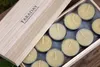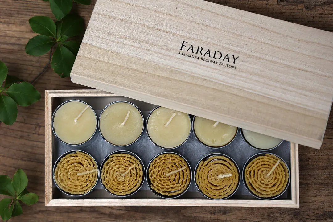 蜜蝋キャンドルの初心者向けには、手軽に、蜜蝋キャンドルのオレンジ色の炎を楽しめるティーライトのセットです。 燃焼時間の短いハニカムティーライトと長く楽しむことが出来る蜜蝋ティーライトをセットに致しました。 どちらもスチールのケース入りのため、蝋がこぼれたりもしません。 燃焼時間が短い(約30分位)ハニカムティーライトは、お食事の際や、バスタイム、お休み前に、手軽にキャドルを楽しむ事が出来ます。 蜜蝋ティーライトの方は、約3-5時間前後の燃焼時間になりますので、ゆっくりとしたリラックスタイムにご利用ください。 ギフトにもピッタリの商品です。 ハニカムティーライト/直径4cmx高さ1,5cm 7g x10個 蜜蝋ティーライト/直径4cmx高さ1,5cm 15g x10個 特注の桐箱のケースが、付属されています。 大切な方へのギフトなど、贈答用のキャンドルとしてご利用下さい。