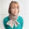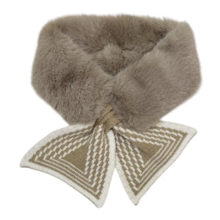 ファー素材とニットを組み合わせた差し込みタイプのショートマフラー。ニット部分は配色の柄編み。フィット感のあるサイズに仕上げています。
