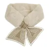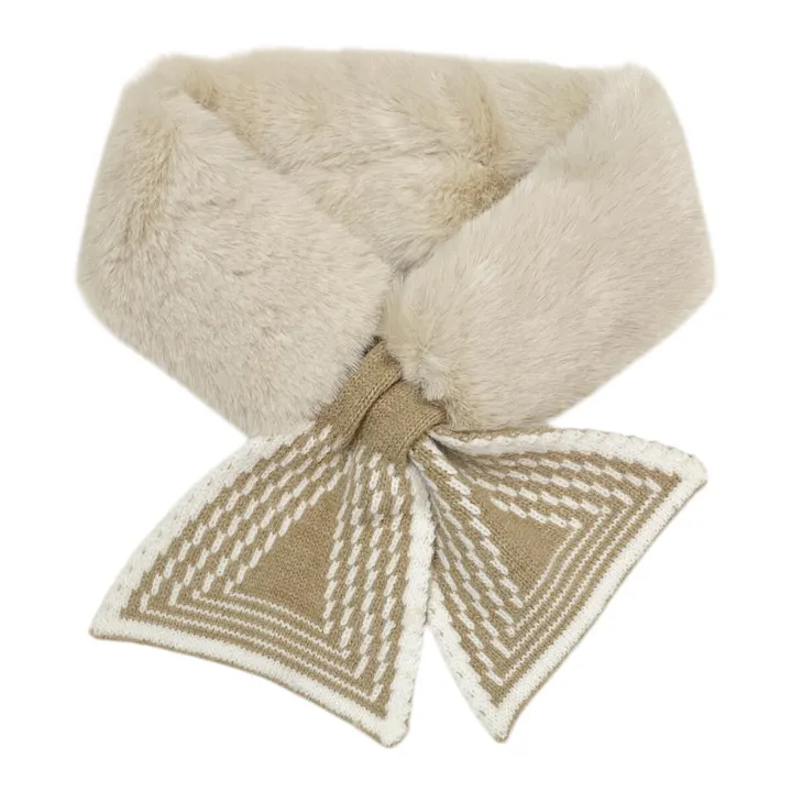 ファー素材とニットを組み合わせた差し込みタイプのショートマフラー。ニット部分は配色の柄編み。フィット感のあるサイズに仕上げています。