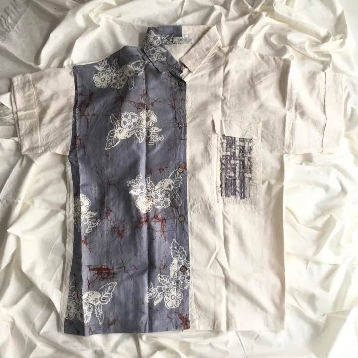 唯一無二のデザイン、日常に寄り添う一着。 ホワイトをベースに、ブルーのバティック模様とブラウンのひび割れ風デザインを組み合わせた、落ち着いた色合いの一着です。シンプルながらも毎日着たくなる快適な着心地で、普段使いにぴったり。 ポケット部分にはユニークな編み込みアクセントを施し、一点ものの特別感を演出しています。 すべて手作業で仕上げられた手織り生地を使用し、伝統的なバティック(ろうけつ染め)技法と自然由来の染料を組み合わせて、温かみのある風合いを実現しました。