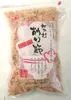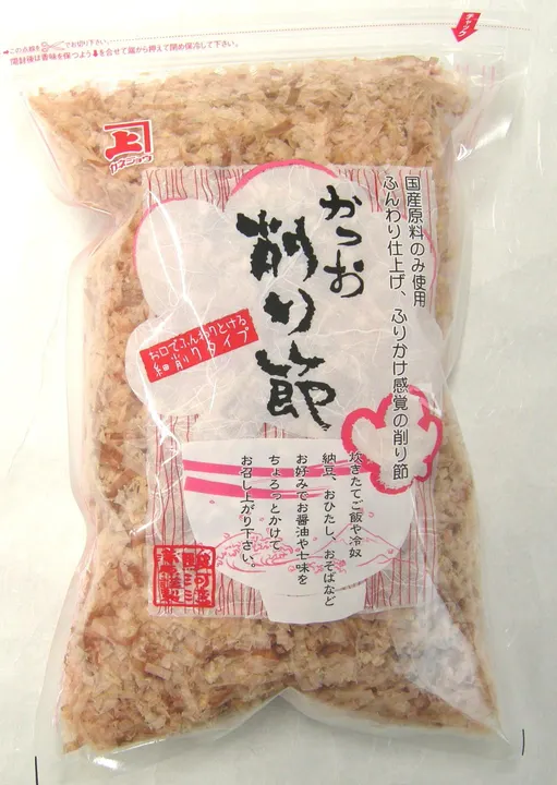 ーーー 【送料に関して】 商品合計が「60袋以上」もしくは「2ケース以上」で送料は弊社負担となります。(北海道・沖縄は除く) ーーー 鹿児島県産のかつお荒本節を料理にのせて食べやすいよう極薄く細く帯状に削ったかつお削り節です。 少しつまんでひねれば 、とっても綺麗な鰹のトッピングができます。 お出汁にもお料理にのせてもお使いやすくなっています。 同じ細削りでも「本枯節」を使っているものよりも当商品のように「荒本節」を使っているものの方が安価になります。 それは「原材料の価格」と「削ったとき出る粉の量(歩留まり)」により価格差あるからです。 【細削りって何?】 かつお節を薄く細く削っているので、弊社では「細削り」と名付けて読んでいます。 一般的には糸削りの一種類として定義されます。 カネジョウでは昭和57年から作る続けているロングセラーとなっています。 当時、かつお削り節といえば幅広く削った通称「花かつお」しかありませんでした。 ですがそのまま食べるには上顎についたりと食べ辛いものです。 そのため、当時はカンナの研磨からすべて自社で行っていた二代目 望月庫次と三代目 望月啓一が「もっと食べやすいかつお削り節を作れないものか?」と考えて生み出したのが、この「かつお細削り」です。 今ではカネジョウのかつお削り節=かつお細削りという代名詞になっています。 【オススメの用途は?】 先述のとおり、お料理などのトッピングにしやすい形状です。 ご飯にかけたり、サラダにかけたり、おうどんにかけたり・・・。 リンゴや桃にかけて、オリーブオイルと塩コショウをふりかけて食べるのもとっても美味しい食べ方です。 【実はダシにもオススメ!】 ダシにするには一般的に幅広(花かつお)を選ばれる方が多いです。 ですけど実は、細削りの方が短い時間でダシも出やすいんです! 削り節はお湯との接地面積が広い方がダシがでます。 細削り幅広と比べてはカットしている分だけ接地面積が広いんですね。 ですのでダシの出方もスピードも細削りの方が早いです。 もちろん、出汁ガラは乾燥させた後、細かく刻んでふりかけにしたり、自然肥料としてもお使い頂けます。 煮出して取るのが面倒な方は、お椀に入れてお湯をかけるだけでもOK。 一緒に昆布やワカメを入れたり、味付けにお醤油やお塩、お味噌を入れれば簡単にプラス1椀が出来上がります。 【使用原料に関して】 鹿児島県で水揚げされた貴重な近海産のかつお荒本節を使用しています。 かつお荒本節は、一般的に使われている荒節よりも大きなサイズのカツオを使用しています。 その分、芯まで燻製が効きすぎることなく、さらにカツオの味がしっかりしています。 【かつお節の発酵は普通の発酵とちょっと違う!?】 一般的に発酵食品というと何をイメージしますか? お醤油、お味噌、お酒、チーズなどいろいろありますよね。 そしてどの食品も発酵させることにより「旨味が醸成されて強くなる」「香りや風味も強くなる」という何かが足されるプラスの変化が起こると思われる方が多いのではないでしょうか? しかし鰹節は違うんです。 発酵という作用により、香りや旨味の一種である雑味を削ぎ落としていく「引くという変化」が生み出されているのです。 このような発行により洗練させるというのは他ではなかなか聞きませんし、とても日本的だなっと思います。 ちなみに、もともと枯節を作る方法は偶然に見つけられたものです。 この方法が発見された江戸時代の当初は、カビの作用により鰹節内の水分を抜くことによる運送中の品質管理の簡便さと長期保管を主な目的として行われてきました。 今では「本枯節が最高」という言い方をするメーカーもありますが、弊社ではまったくそうは思いません。 もともと地域性のもとで選ばれてきた鰹節の種類ですし、料理によって向き不向きや人によって好きずきがあります。 料亭のお吸い物では上品さと透明さを求めて本枯節の血合い抜きが選ばれることもあるでしょう。 またはラーメン店などではよりガツンとしたインパクトが求めて、脂が多く燻製が強いものを求めることもあるでしょう。 お客様におかれましては、自分好みを見つけて頂くことも一つの食の楽しみでもあるかと思います。 「鰹節だったらこれ!」と思い込まず、いろいろなものをお試し頂けますとメーカー冥利につきます。 ●栄養成分(100g当り) 熱 量:340kcal タンパク質:78g 脂 質:3g 炭 水 化 物:0.8g 食塩相当量:1.12g