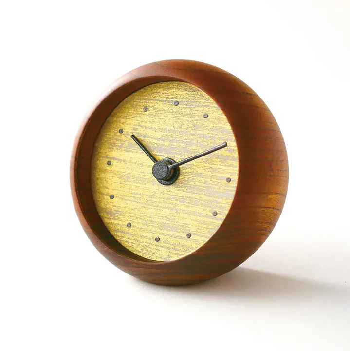 金沢の二俣町で作られている手漉き和紙の上に金箔を貼りました。 線状の模様が入った和紙(落水紙)を使用し、凹凸の凸部分だけに箔を貼りかすれさせることで、水面や雲のような風景を感じる文字盤になりました。 模様のかたちに糊を置き、その上に金などの箔を貼り付け、その後、余分な箔を刷毛などで払い落として模様を表わす技法を「摺箔(すりはく)」と呼びます。伝統の技法や素材の魅力を、インテリアの一部としてお楽しみください。 摺箔のかすれ具合は一つ一つ異なり、個体差があります。予めご了承ください。 時間を示す点々(インデックス)は、黒の木地のタイプは、黒の天然岩絵具、プレーンとブラウンの木地はいぶし銀箔です。 ■木の部分の色は、プレーン・ブラウン・ブラックの三色をご用意しております。 ■裏面カバーにオリジナルの刻印を入れることができます。(有料 +880円税込) ■受注生産のため、基本的にご注文いただいてから約2週間のお時間をいただきます。ご了承ください。 【時計部分の仕様】 ・日本製・1年保証・本体のサイズ:直径10cm厚さ5.4cm・使用電池:単3形乾電池 【付属品】 ・単3乾電池1個・取扱説明書1部・牛革製裏面カバー