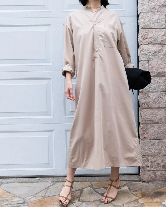 風をはらむほどの体が泳ぐフォルム。 さらりとした肌触り。 程よい艶とハリ感。 身体も心も委ねられる、そんな気持ちのいい服。 -DESIGN- ご愛用いただいたその先は、sleep wearとして最後まで着用いただけるように、よりシンプルさとコンフォートさを追求したディテール。 ・肩のラインは少し前に移動することで、自然と着用した時に肩が抜けるように。 ・背中にはヨーク切り替えと言われる横線(縫い目)を省き、くつろいだ時の肌に当たる違和感を無くしたコンフォートなデザイン。 ・袖口は筒状にし、袖口幅はゆったり目に。 カフスにはスリットを入れ、デザイン性と機能性を。 ・衿は首に触れる部分なので、着心地を最優先に、柔らかめと仕立てた気づかい。 ・第一釦は胸のあたりから始まり、ざっくり開いたVラインが、デコルテを生かす計算されたディテール。ほのかにセンシュアリティを感じさせる。 -MATERIAL- 忙しい女性のため、形態安定加工済みの生地を使用。 *フィールドテストの結果、シワは付きますが蒸気で取れやすいというのが特徴です。 身体に優しく、気持ちを優しくするワンピース。 お家で過ごす時間、もちろんそのまま街着として、そんな日常をボーダーレスに楽しむ。ニュースタンダードなアイテムをご提供します。