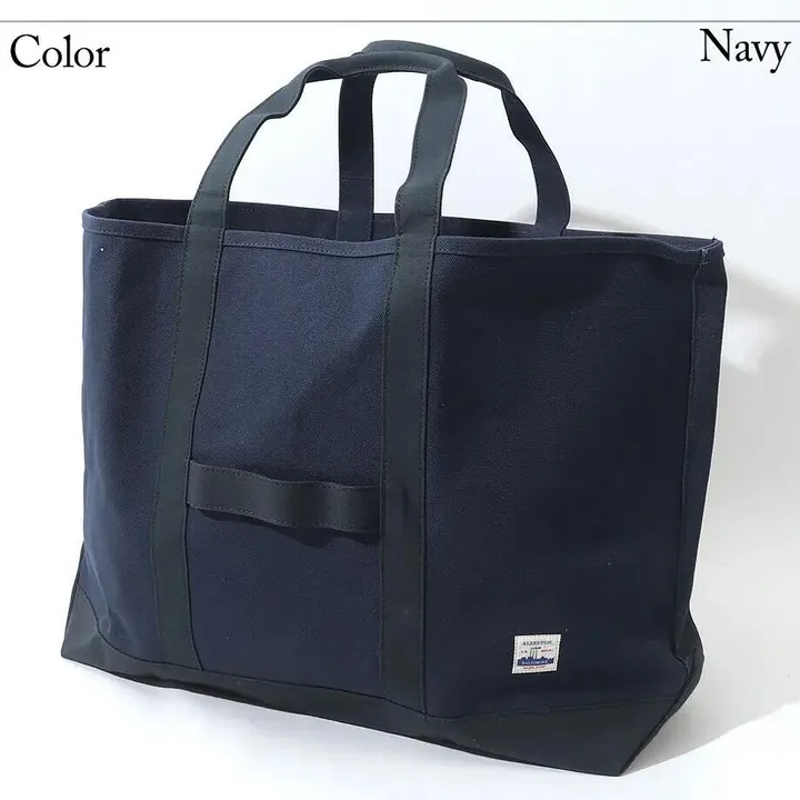 幻のシャトル織機で織った生地を用い,特別な織機だからこそ生み出せた強靭さ!世界に唯一の希少な織機で昔、アメリカの炭鉱で石炭を運ぶ為に作られた生地を忠実に再現しました。 4号帆布に比べ元の生地が丈夫なため、樹脂を使わずに形を保つ強靭さを備えています。 この規格の織物を当時の仕様で織ることが出来るのでalbertonだけです。 何故ならば、albertonは100年前のデットストックの新品織機をカスタマイズして現代に甦らせたからです。 織物の耳近くに青い色糸が織り込まれています。 これはA.S.T.M標準規格D230-44によって指示されているもので、縫製の際ミシンを入れる場所の目印にする為になるものでしたが、本来の用途以外でも工業用DUCKが使われ出した為古い製品にはこのBLUE LINEが無作為に入っているものが多く存在し、今ではヴィンテージの証の様になっていますがalbertonはこれも忠実に再現しています 超大型のトートバッグ。大容量で普段使い、レジャーやアウトドアなど多用途にお使いいただけます。 コットン100%なのにこの丈夫さ!中身が空っぽでも自立した状態で置け、中身が出し入れしやすい! 色相はカーキドラブ、ネイビーになります -サイズ- 高さ:約44cm 横幅:約55cm(ボトム)、約70cm(トップ) マチ幅:約20cm ※この商品は、シャトル織機で織り上げた耳付き帆布生地を使用しております。その為、節やネップがある場合があります。これらは織機生地特有のものであり素材欠点ではございません。あらかじめご了承ください。 ※天然素材を使用しておりますので、現在の染色技術では摩擦、水濡れ等による脱色や移染、また日光および蛍光灯で多少変色する場合がございます。