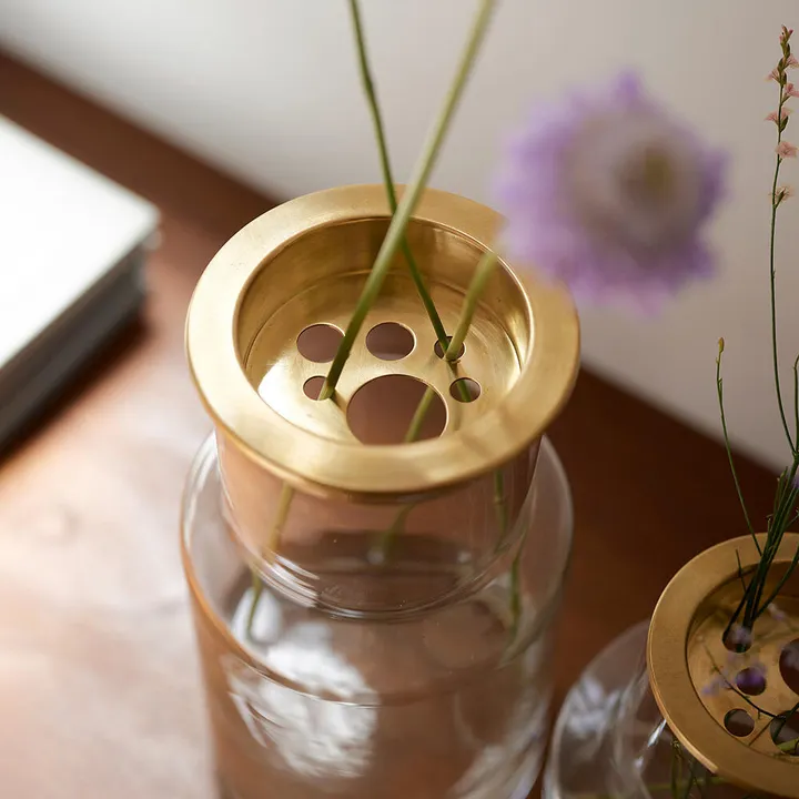 shesayのリューズガラスのフラワーベース、ネックやロケートに合わせたブラスのトレーです。 口の広い花瓶は生ける花の本数が少ないと生けた時にバラバラっと広がりバランスが悪く見えてしまいます。 また茎がしなやかな植物も口の広い花瓶だとしなだれてしまって見栄えがよくありません。 そんな、少し生けづらい時に使うと便利な真鍮製のトレー。 様々なサイズの穴が開いており、太めの枝から細めの植物まで生けやすくしてくれるアイテムです。 花瓶を何個も持たなくても、1つでいろいろな植物をバランスよく生けることができます。 (L)*対応商品:371814 (S)*対応商品:372156・372157 【フラワーベース】【花瓶】【真鍮】【ブラス】【生け花ベース】