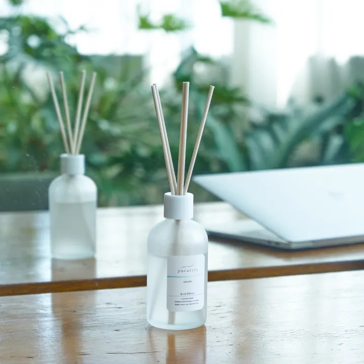 pucarito(プカリト) こころも プカリと じゆうな わたし 天然精油配合のフレグランスシリーズ。 気分に合わせて選べる、香りとアイテム。 スティックを挿すだけで、手軽に香りが楽しめます。 寝室や玄関などお好きな場所で。 ukabu(ウカブ) 透き通るシャボン玉のように、ふっと心も浮かんだらいいな。 ジャスミンとすずらんの心地よい香りに果実の甘さを加えた、透明感のある爽やかな香り。 hodokeru(ホドケル) ふわっとほどける綿毛のように、軽やかに、わたしらしく。 オレンジとグレープフルーツのジューシーな香りに落ち着いたアンバーが織りなす、優しく包み込むような香り。 ※原料となる天然精油の収穫時期により色味に違いが出ることがございます。(画像4枚目) tayutau(タユタウ) 水面にただよう葉っぱのように、自由気ままに イランイランやムスクに木々の柔らかく濃厚な香りが調和する、しっとりとした上品な香り。 ●使用目安期間:約1.5~2か月