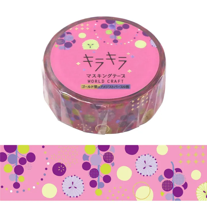 【 キラキラマスキングテープ 15mm Grape】  ★★ 箔を使用した、キラキラが可愛いキラキラマスキングテープ 〜 第4弾  Aqua,Decoration、Fruits の3つをテーマに <12柄> を揃えました ★★ 口の中に広がるあまみと酸味がたまらない、はじけてジューシー!コロコロ きらきら ぶどう! ほっぺに幸せを詰めて、みんなにこにこ笑顔に♪ 『ゴールド箔とアメジストパープル箔』 を使用しています♪