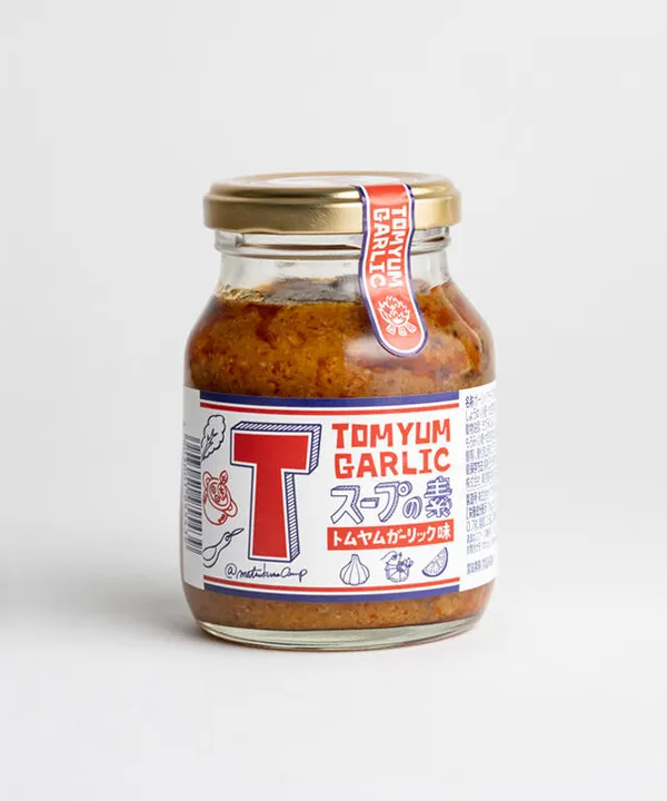 Tスープの素は水で希釈しお好みの具材を煮込むだけの絶品トムヤムスープの素です。 ※本品は26年5月中旬に味の方向性、価格はそのままで、ラベルパッケージおよび原材料を変更する予定です。 【使い方】 基本のスープ:お湯200㏄に、Tスープの素大さじ1杯(小さじ3~4杯) トムヤム炒飯:ご飯150gに、Tスープの素大さじ1杯(小さじ3~4杯) 余った食材とコトコト煮込んでいただくだけで食欲のそそる、ほどよい酸味のちょい辛なスープが簡単にできます。 また、旨味たっぷりのタレなので、そのままでもディップソースとしてお楽しみいただけます。 Tスープの素1壜で2L程度のスープが作れます。 【商品特長】 ・青森県産ブランドにんにく「福地ホワイト6片」を使用しており、豊かな香りとクセになるヤミツキさがあります。 ・本場タイの調味料工場で、レモングラスやガランガーをふんだんに使いフレッシュな香りを閉じ込めた特製トムヤムペーストを使用しています。 ・取っ手付きの可愛らしい壜に入っています。 ・辛さは少なく、パクチーも入ってませんので、どなたでも美味しく召し上げれます。 【おススメメニュー】 トムヤムスープはもちろん、夏はそうめんつゆ、冬はおでんのスープとしても美味しいです。そのまま餃子や蒸し鶏のタレにもおススメです。