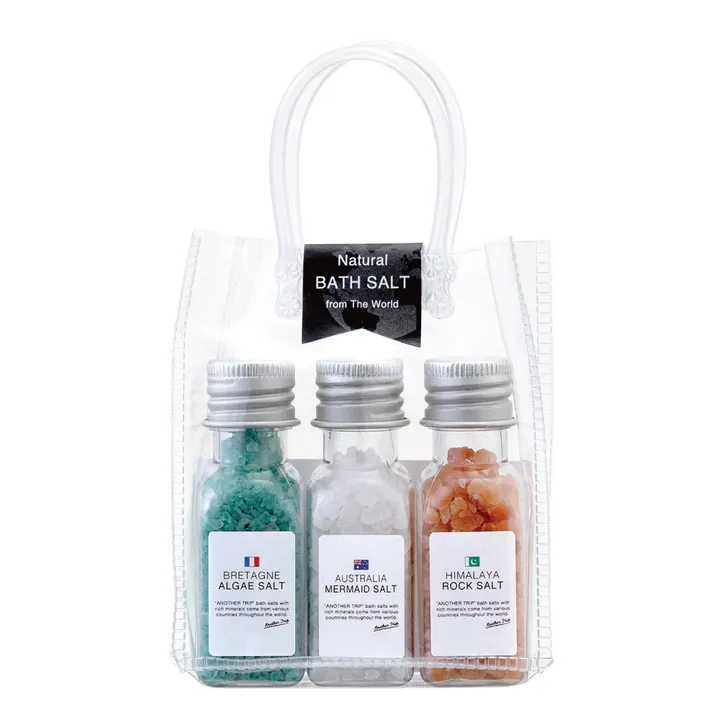 「トロワ ボヤージュ」とは、フランス語で「3つの旅」。 フランス、オーストラリア、そしてヒマラヤ…それぞれの国で採れた自然塩を我が家のバスタブで楽しめます。 ほら、心はもうバスルームを旅立って遙かな国へ…。 【湯色】透明(※ブルターニュ アルグソルトのみクリアグリーン) ・ブルターニュ アルグソルト フランス・ブルターニュ産の自然塩に海藻保湿成分(ラミナリアディギタータ)をプラス ・オーストラリア マーメイドソルト 南極からつながる南オーストラリアの海水を自然結晶させた天日塩 ・ヒマラヤ ロックソルト 太古の地殻変動で閉じ込められた海水が長い歳月をかけて結晶化した自然塩