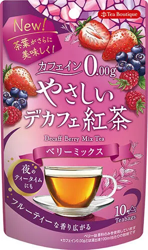 渋みの少ないすっきりしたセイロンティーに、ストロベリーやブルーベリー、ラズベリーなど人気のベリーが甘く華やかに香ります。 カフェイン0.00g*でも、味と香りにこだわった「やさしいデカフェ紅茶」シリーズ。ベリーミックスは渋みの少ないすっきりしたセイロンティーに、ストロベリーやブルーベリー、ラズベリーなど人気のベリーが甘く華やかに香ります。夜でも気にせずティータイムを楽しみたい方、カフェインが苦手な女性やお子様にもおすすめです。 デカフェとは…「デカフェ」とはカフェインを含んだ茶葉から、できる限りカフェインを取り除いたもの。「やさしいデカフェ」シリーズは、化学薬品を使用しない「超臨界二酸化炭素抽出法」という安全な方法で、カフェインを除去しています。 *カフェイン0.00gとは浸出液の場合の数値です。 【やさしいデカフェ】 カフェイン0.00g*でもきちんと味と香りにこだわった、“やさしいデカフェ紅茶”シリーズ。 「時間を気にせず、おいしい紅茶を楽しんでほしい」との想いから開発し、発売から10年を迎える事ができました。おいしさを追求し、セイロンティーをベースとした多くのフレーバーを発売。今後とも様々なシーンで楽しめるデカフェ紅茶をお届けしてまいります。 名称:ブレンドティー