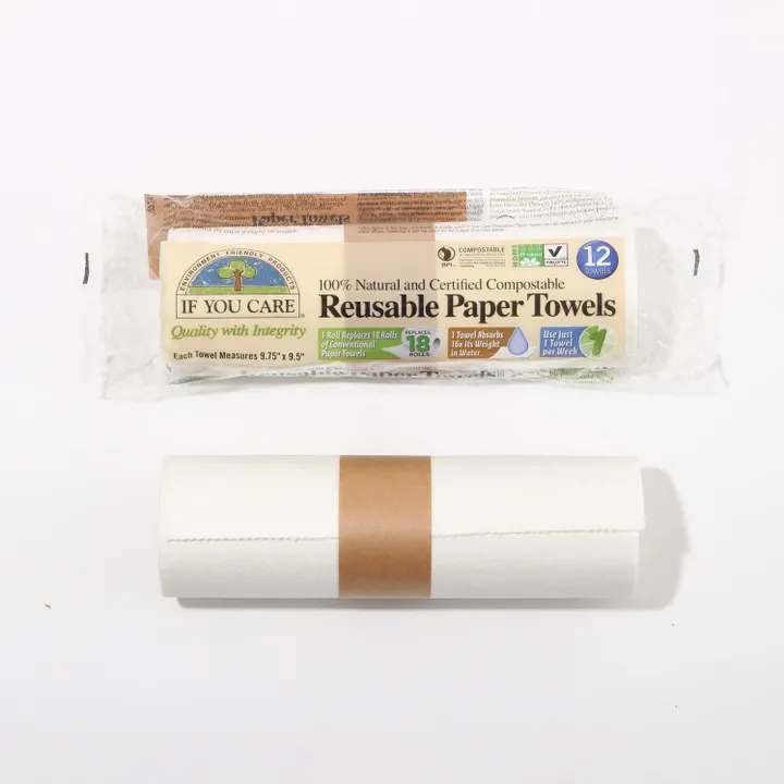 イフユーケアリユーザブルペーパータオルは、セルロース、非遺伝子組み換えの無漂白コットン、天然ミネラル塩であるミラビライトを三次元的にブレンドした特許取得済みの製法で作られています。製造工程では、ミラビライトは洗い流され、残りのブレンド(セルロース70%と綿30%)は非常に多孔質であるため、タオルは非常に吸収性が高くなります。水に対し自重の16倍もの吸収力があります。竹製のタオルとは異なり、何度洗濯しても繊維が表面に残ることはありません。 クリーニング キッチンやバスルームのカウンターを拭くのにこれ以上に効果的なタオルはありません。イフユーケアの繰り返し使えるペーパータオルは抜き後が残りません。簡単に液体を吸収し、絞るだけで放出します。驚くほどの耐久性があり、引き裂きや摩耗に強く、少なくとも1週間は再利用できます。 環境について アメリカ人は毎日、600万ポンド(3000トン)のペーパータオルを捨てています。私たちが数秒使っただけで捨ててしまうペーパータオルを生産するためには、1日あたり51,000本の木と6,000万ガロンの水が必要です。当社の再利用可能なペーパータオルを週に1枚使用することで、1ロールで従来のペーパータオル18ロールの代わりになります(1週間の平均的な家庭でのペーパータオルの使用量=1.5ロールを基準にしています)。また、パッケージはコーンスターチから作られたバイオポリマーで、商業的な堆肥化施設で堆肥化可能なことが認証されており、廃棄物、温室効果ガス、埋め立て地からの転用をさらに減らすことができます。 使い方とお手入れ 余分な水分をすすぎ、絞って吸収性を高めます。水、石鹸、水または家庭用洗剤と一緒に使用してください。塩素系漂白剤や塩素系製品は使用しないでください。ご使用の間と使用後は十分にすすぎます。洗い流した後、平らにして乾燥させてください。石鹸とぬるま湯で手洗いしてください。 イージーケア! 水に濡らしたリユーザブルペーパータオルを電子レンジ(500W/1分)にかけるか、沸騰したお湯で1分間煮沸するだけで滅菌することができます。 イフユーケアのリユーザブルペーパータオルとそのパッケージは、どちらもコンポスト可能な認証を受けていることをご存知でしたか? 使用後はコンポストに捨ててください。分別する必要はありません。