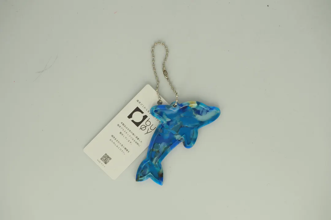 イルカの形のキーホルダーです。 buoyの製品は全て日本各地で回収された海洋プラスチックごみを材料に作っています。着色などの加工を加えず、偶然海岸に漂着した色味でできています。 明るい発色が特徴のプラスチックですが、複数の色が交じり合うことでちょっと有機的なモザイク模様が特徴です。 製品にはひとつひとつゴミの漂着地域が明記されています。日本で起きている海洋ごみの問題をリアルに感じることができます。 また、商品に添付されているQRコードを読み込むとそれぞれの回収を行ったビーチクリーン団体さんの情報を見ることができます。 ------------------------------------------------------------------- 海洋プラスチックごみを材料に変える独自技術buoyの特徴 (buoyは海洋プラスチックごみ素材使用を前提にした株式会社テクノラボの独自技術により成形しています。株式会社テクノラボは本技術において特許取得済み) ◆材料を分けないで成形するため生まれる独自の模様 材料はすべて着色せず海洋ごみの色を活かして成形しています。偶然生まれる色と模様は回収された漂着ごみによって決まります。 ◆製品の重さが海洋ごみの重さ 製品をコーティングしているフィルム以外、混ぜ物などせず海洋ごみでできているので製品の重みから海洋ごみ問題を感じられます。 ◆製品にすべて材料の漂着地を明記 buoyは日本各地のビーチクリーンボランティアや企業の方から材料を提供していただいています。これらの材料は時期と地域を分けて管理され、製品にはすべて材料産地のシールを貼り販売しています。 buoyの材料産地をきっかけに回収された地域のことを知ってほしいとの思いからbuoyでは団体様の紹介ページを作成しています。 http://www.techno-labo.com/rebirth/partner/ -------------------------------------------------------------------