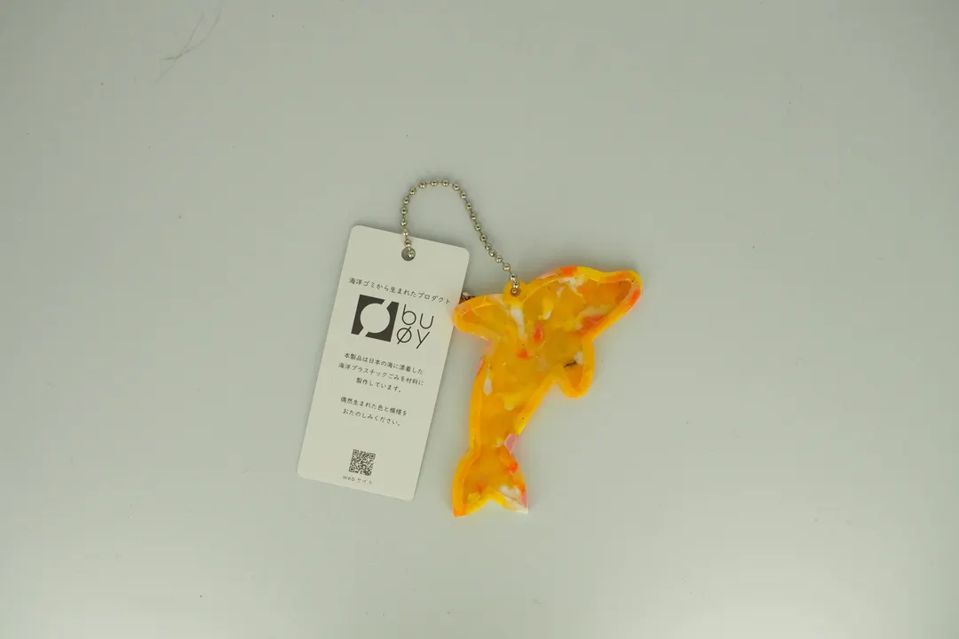 イルカの形のキーホルダーです。 buoyの製品は全て日本各地で回収された海洋プラスチックごみを材料に作っています。着色などの加工を加えず、偶然海岸に漂着した色味でできています。 明るい発色が特徴のプラスチックですが、複数の色が交じり合うことでちょっと有機的なモザイク模様が特徴です。 製品にはひとつひとつゴミの漂着地域が明記されています。日本で起きている海洋ごみの問題をリアルに感じることができます。 また、商品に添付されているQRコードを読み込むとそれぞれの回収を行ったビーチクリーン団体さんの情報を見ることができます。 ------------------------------------------------------------------- 海洋プラスチックごみを材料に変える独自技術buoyの特徴 (buoyは海洋プラスチックごみ素材使用を前提にした株式会社テクノラボの独自技術により成形しています。株式会社テクノラボは本技術において特許取得済み) ◆材料を分けないで成形するため生まれる独自の模様 材料はすべて着色せず海洋ごみの色を活かして成形しています。偶然生まれる色と模様は回収された漂着ごみによって決まります。 ◆製品の重さが海洋ごみの重さ 製品をコーティングしているフィルム以外、混ぜ物などせず海洋ごみでできているので製品の重みから海洋ごみ問題を感じられます。 ◆製品にすべて材料の漂着地を明記 buoyは日本各地のビーチクリーンボランティアや企業の方から材料を提供していただいています。これらの材料は時期と地域を分けて管理され、製品にはすべて材料産地のシールを貼り販売しています。 buoyの材料産地をきっかけに回収された地域のことを知ってほしいとの思いからbuoyでは団体様の紹介ページを作成しています。 http://www.techno-labo.com/rebirth/partner/ -------------------------------------------------------------------