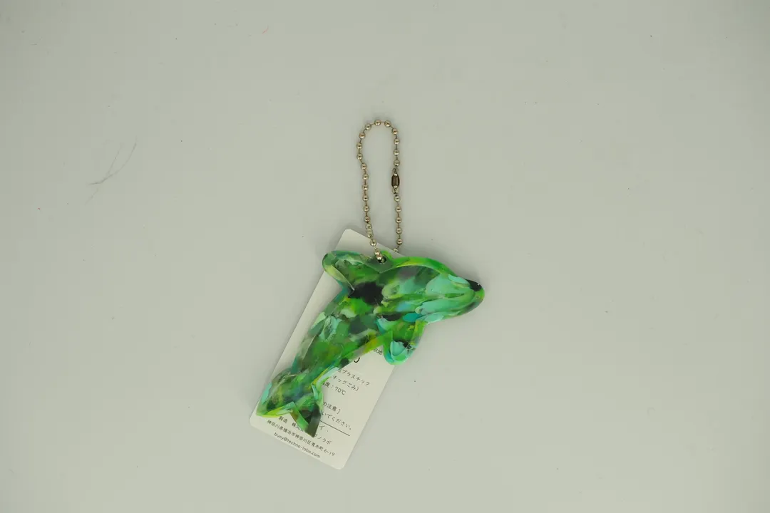 イルカの形のキーホルダーです。 buoyの製品は全て日本各地で回収された海洋プラスチックごみを材料に作っています。着色などの加工を加えず、偶然海岸に漂着した色味でできています。 明るい発色が特徴のプラスチックですが、複数の色が交じり合うことでちょっと有機的なモザイク模様が特徴です。 製品にはひとつひとつゴミの漂着地域が明記されています。日本で起きている海洋ごみの問題をリアルに感じることができます。 また、商品に添付されているQRコードを読み込むとそれぞれの回収を行ったビーチクリーン団体さんの情報を見ることができます。 ------------------------------------------------------------------- 海洋プラスチックごみを材料に変える独自技術buoyの特徴 (buoyは海洋プラスチックごみ素材使用を前提にした株式会社テクノラボの独自技術により成形しています。株式会社テクノラボは本技術において特許取得済み) ◆材料を分けないで成形するため生まれる独自の模様 材料はすべて着色せず海洋ごみの色を活かして成形しています。偶然生まれる色と模様は回収された漂着ごみによって決まります。 ◆製品の重さが海洋ごみの重さ 製品をコーティングしているフィルム以外、混ぜ物などせず海洋ごみでできているので製品の重みから海洋ごみ問題を感じられます。 ◆製品にすべて材料の漂着地を明記 buoyは日本各地のビーチクリーンボランティアや企業の方から材料を提供していただいています。これらの材料は時期と地域を分けて管理され、製品にはすべて材料産地のシールを貼り販売しています。 buoyの材料産地をきっかけに回収された地域のことを知ってほしいとの思いからbuoyでは団体様の紹介ページを作成しています。 http://www.techno-labo.com/rebirth/partner/ -------------------------------------------------------------------