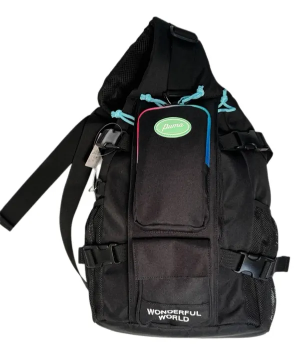 左右コンプレッションテープ付き。 オリジナルチャーム付き。 外ファスナーポケット、フラップポケット付き。 内装オープンポケット付き。 メッシュポケット2個付き。