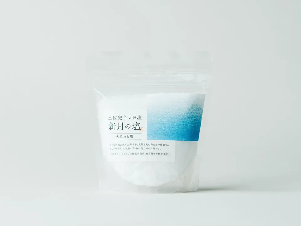 ■高知県の恵み、新月の塩 高知県の美しい海で作られた、土佐完全天日塩・新月の塩。 新月の大潮の時期に汲み上げた海水を、太陽と風、自然の力で結晶化させた特別なお塩です。 職人の手でじっくりと塩を結晶化させ、一粒一粒に海のミネラルが閉じ込められています。 たっぷり使える大きいサイズです。 ■爽やかでクリアな海の味 新月の塩は、優しい風味の中にクリアな塩味。素材の味を引き立てながら、お塩そのものの風味を楽しめます。普段の食事に、ほのかな贅沢感をプラスしたい方におすすめです。 ■幅広い料理に活躍します! 茹でた季節野菜や魚の蒸し料理、おにぎりな、あっさりとしたお料理におすすめ。 ぱらりとふりかけるだけで美味しい一品が出来上がります。持ち歩いて、お茶や水にひと振りすることで、体調管理の一助にもなります。 ● 新月の時期に汲み上げた海水を使用 ● 優しい風味と心地よい余韻が特徴 ● あっさりしたお料理と相性ぴったり ● 小粒は、茹でた季節野菜や魚の蒸し料理、おにぎりなど ● 大粒は、グリル野菜や鶏肉におすすめ 【品 名】土佐完全天日塩 新月の塩 大粒 【原材料】海水(高知県幡多郡黒潮町) 【内容量】200g 【製造者】月海製塩(つきみせいえん) 【保存方法】直射日光・高温多湿を避け、常温で保存してください。 新月の塩 成分表示(100g当たり) エネルギー:0kcal たんぱく質:0g 脂質:0g 炭水化物:0g 食塩相当量:89.1g カルシウム:570mg マグネシウム:390mg カリウム:140mg