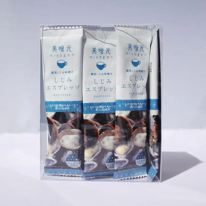 【しじみエスプレッソ】 私たちの主力商品「しじみエスプレッソ」は、 「疲れたとき」「飲む前に」「飲んだ後に」「爽やかな目覚めに」と、様々なシーンで活躍する濃厚しじみ味噌汁です。 八丁味噌をベースに信州赤白合わせ味噌とブレンドし、スッキリとした味わいと深いコクを実現。 1杯90ccにしじみ100個分のオルニチン約51mgを配合しました。 スティックタイプで持ち運びも便利なため、オフィスでのコーヒーブレイクの代わりに「味噌汁ブレイク」として愛用されています。