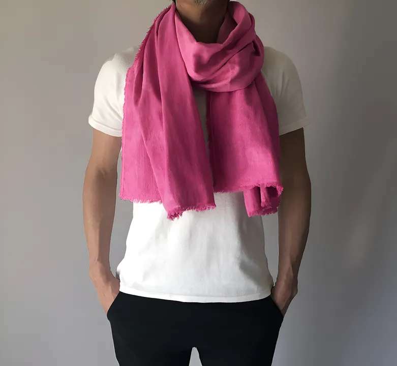 軽量感のある「オーガニックコットン100%のダブルガーゼ」を贅沢に大判サイズで使用しております。季節感を捉えて爽やかな色合いに仕上げた新商品でもあります。ダブルガーゼストールは大判デザインのため、首元のボリューム感を十分に演出。またストールの端始末をフリンジ始末にすることで、カジュアル感としなやかさが加わり多様な着こなしに対応してくれる万能ストールです。 「チェリーピンク」は今回開発されたNEWカラーになります。季節感ある優しく華やかなピンクになります。 アカネを中心に色材配合し、春らしい爽やかな色合いに染上がる色調にしております。またオーガニックコットン100%のダブルガーゼ素材が首元を優しく包みつつも、通気性の高い素材のため、様々なシーンや服装に合わせたくなるストールです。 こちらの「ダブルガーゼ」も大判ストールとなっておりますので、男女兼用でご利用頂けます。 *ヴィーガンストールは、「植物由来成分100%」のため、どなたのお肌にも寄り添う優しい風合いになります。 またヴィーガン製品は「動物保護」の観点からも地球環境に配慮された製品になります。 【デザインの特徴】 ①縦長さ200㎝/横幅56㎝の大判型のストールになります。大判効果で小顔映えします!女性の方は男性以上にボリューム感をお楽しみ頂けます! ②ストール生地の端始末は、軽さとしなやかさ、更にカジュアル感を出すために、あえて「フリンジ始末」としております。フリンジもデザインとなりますのでご了承ください! ・一点一点ていねいに染め上げてから発送させていただきます。 ・想定以上のご予約が入った場合、生産にお時間を頂く兼ね合いから配送予定にお時間を要することがございます。その際はご連絡をさせて頂きますことをご了承ください。