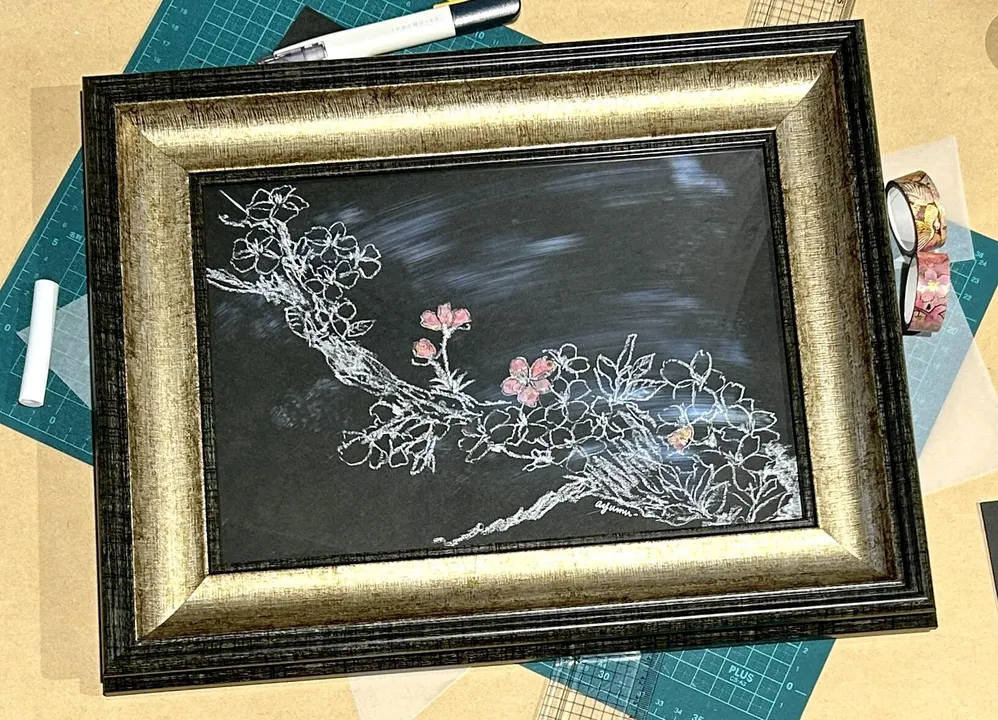 "チョークアート×切り絵×マスキングテープを掛け合わせた、唯一無二の作品です。 同じものは二度と描けないので1点ものとなります。 ”モノクロの世界にイロドリを”をテーマに、 色を失った日本人(白黒の世界)に色を足していく、 そんなイメージで作品を制作しています。" 本商品は1点ものです。