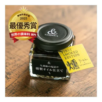 世界有数の胡椒の名産地「カンポット(カンボジア)」。 ミネラル豊富な土壌と独特な気候の中 100年の時を越えて受け継がれる伝統農法により 大切に育てられた胡椒は、さながら宝石のような美しさ。 広大な畑の中、 まだ柔らかな若い実を厳選し 生のまま、贅沢に天日塩で漬けたのが 当店看板商品である「生胡椒の塩漬け」です。 ───────────────────────── ◎”日本一の調味料”を決める「第16回調味料選手権2025」で最優秀賞を受賞しました! ◎J-WAVE『ALL GOOD FRIDAY』でご紹介いただきました! ◎瓶のサイズは「生胡椒の塩漬け(15g瓶)」と全く同じです。 (参考リンク→→→ t.ly/QOiuu ) ───────────────────────── 「生胡椒の塩漬け」に、オイルをまとわせるとどうだろう? 試作を繰り返しては悩みながら、数年このアイデアを温めてきました。 そんな中ふと燻製オイルを分けていただく機会があり試作してみたところ、これまでにない「しっくり感」が得られ、あれよあれよという間に商品化へと進んだのがこちらの商品です。 オイルを燻していただいているのは、 私・速水も長年お世話になっている広島の人気燻製店「燻製シマヘイ」さんです。 シマヘイさんが工房でクセのないグレープシードオイルを燻製にされているのを知り、生胡椒と合わせてみたらこれが相性抜群! 「生胡椒の塩漬け」と「特製燻製オイル」、 この2つの個性を最大限伸ばすべく、真空低温調理にヒントを得た最終加工にてじっくり仕上げています。 これにより、燻香・旨味・食感が三位一体となった「生胡椒の塩漬け〜燻製オイル仕立て〜」が完成しました。 例えばクリームチーズに乗せるだけでプレミアムおつまみが出来上がったりと、 たったひとさじでいつものお料理や食材がレストラン級にグレードアップ! 皆さんの食卓に新しい感動をお届けできることを願っています。 ───────── ◯ 生胡椒の塩漬け〜燻製オイル仕立て〜 ◯ 内容量:26g ◯ パッケージ:瓶 ◯ 賞味期限:製造から1年 ◯ 保管方法  ┗ 未開封:常温  ┗ 開封後:冷蔵庫保管の上お早めにお召し上がりください ◯ おすすめの食べ方 …万能調味料としてお楽しみいただけます。 トッピングとしてお料理と一緒に楽しむも良し。 または別添えの「味変」調味料として、 お料理をほおばった直後に食し、お口の中での調和を楽しむも良し、です。 生卵(黄身)、お肉料理、お豆腐、チーズなど様々な食材、お料理と相性の良い調味料です。 ▼ ・卵かけご飯 他卵料理 ・ポテサラに ・お豆腐にのせて ・お肉料理 ・お刺身 ・鍋料理の薬味として ・おでん ・クリーム系パスタ ・サラダ ・チーズ ・燻製料理 ・お酒のお共 ☆美味しい食べ方を発見されたら是非インスタグラムにてお知らせくださいね! #アンドカンボジア #生胡椒の塩漬け #燻製オイル仕立て