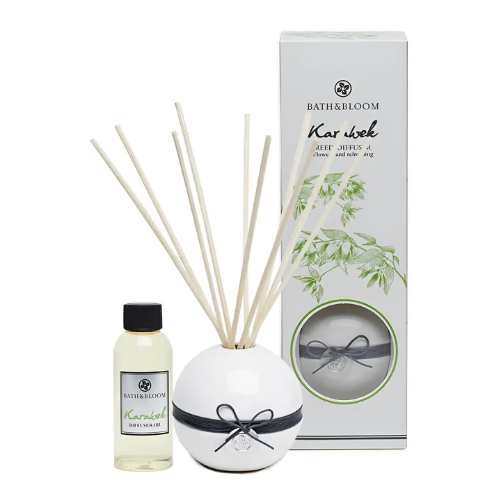 〔 カラウィク リードディフューザーセット 〕内容量:100mlオイル リード 容器付 フローラルとリフレッシュを与える香り このディフューザーは、強く甘い香りが印象づけられますが、タイの文化や習慣に代表されるカラウィク花から漂う気品のある香りです。バス&ブルーム カラウィク ディフューザーでタイの礼儀を体験してみて下さい。私たちの温かいおもてなしが詰まったタイのエッセンスをお楽しみ下さい。 〔 成分一覧 〕 水,エタノール,香料 〔 ご使用方法 〕 セラミック容器にディフューザーオイルを注ぎます。オイルを吸収させるようにリード(スティック棒)を容器に入れて下さい。吸収したリードを逆さまにし、乾いている棒を容器に入れて設置して下さい。お部屋に香りが広がりはじめます。リードの先から香りが広がりますので、香りが弱くなった場合には、オイルで浸されている部分を上にひっくり返して下さい。新鮮な香りが広がります。 設置場所環境によりますが、1ヶ月〜2ヶ月程度持続。