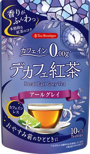 アールグレイは柑橘系果実ベルガモットの香りが漂う爽やかなフレーバーティー。大切なくつろぎの時間を優雅に彩ります。夜でも気にせずティータイムを楽しみたい方、カフェインが苦手な女性やお子様にもおすすめです。 カフェイン0.00g*でも、味と香りにこだわった「デカフェ」シリーズです。 デカフェとは…「デカフェ」とはカフェインを含んだ茶葉から、できる限りカフェインを取り除いたもの。「デカフェ」シリーズは、化学薬品を使用しない「超臨界二酸化炭素抽出法」という安全な方法で、カフェインを除去しています。 *カフェイン0.00gとは浸出液の場合の数値です。 【デカフェ】 カフェイン0.00g*でもきちんと味と香りにこだわった、“デカフェ紅茶”シリーズ。 「時間を気にせず、おいしい紅茶を楽しんでほしい」との想いから開発し、発売から10年を迎える事ができました。おいしさを追求し、セイロンティーをベースとした多くのフレーバーを発売。今後とも様々なシーンで楽しめるデカフェ紅茶をお届けしてまいります。 名称:ブレンドティー