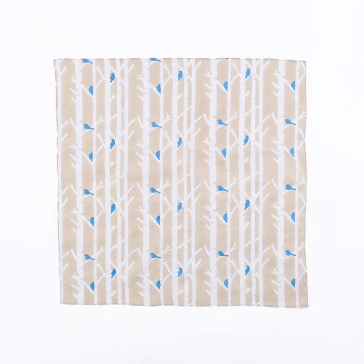 静けさが広がる北欧の森の中で、さえづる鳥達をイメージしたハンカチ。白く美しいシラカバと色鮮やかな鳥のコントラストが目を引くデザインです。優しい色使いと素朴なプリントの風合いが使う人の心を和ませてくれます。 ブロックプリントとは、木彫り版でハンコを押すように1柄ずつ1色ずつプリントされたものです。まず、アウトラインとなる柄のスタンプを押していき、その後色を乗せていきます。使われている色の数だけ作業は複雑になっていきます。全て手作業の為、染ムラやスタンプの境目などが少し出ていますが、それがブロックプリントの良さでもあり、風合いとなっております。 インドで生産しているファブリックは、手作業で裁断・縫製しているため、同じ商品でも大きさに多少のバラつきがあり、裁断する場所によって柄のズレが生じます。また商品によっては風合いを重視した生地を使用するため多少の織り傷、毛玉がある場合もあります。プリントものは熟練した職人がスクリーンや木版を使用し手刷りで仕上げているため、その時の天候や気温、湿度、また生地の状態によって色のブレが生じたり、色ムラ・かすれ等も見られる場合がありますが、手刷りならではの味わい深い風合いのひとつです。長くご使用いただくために、お洗濯の際は手洗いでお願いします。また、乾燥機による乾燥は布地の傷みや縮みにつながるためお避けください。
