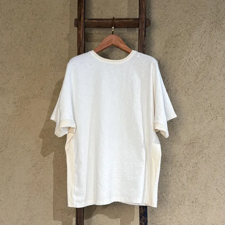 ヘンプ55%オーガニックコットン45%の薄手の平織生地を用いたユニセックスTシャツ。 サラッとしながらも肌触りが良く、 着用するほどに肌になじむナチュラルで気持ち良い平織生地を使用。 Tシャツでありながらきちんとした印象があり、 どんなお洋服にもすっきり合わせていただけます。 脇、首周りに伸縮するジャージー素材を使用することにより、 着用しやすく動きやすく、両面表として使用可能なデザイン。 季節を問わずインナーとして、 また1枚でも美しくすっきり着用していただけます。 ヘンプ×コットンの混紡は通気性・保温性・調温性・調湿作用に優れ、コットンのやわらかい肌ざわりのよさとヘンプの丈夫な素材感をあわせ持つ、環境と身体にやさしい素材です。 ヘンプについて詳しくはこちらから ▷(https://www.hempfabric-organic.com/hemp) COLOR:black SIZE:1 着丈 67cm 身幅 58cm 襟〜袖丈 40.5cm 袖口幅 20.5cm SIZE:2 着丈 67.5cm 身幅 60cm 襟〜袖丈43cm 袖口幅22cm