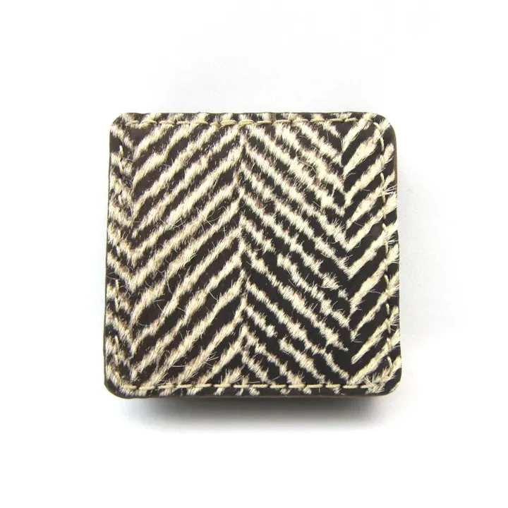 とても使いやすいボックス式のコインケースです。手のひらにすっぽり収まるコンパクトなサイズなのに、箱型で口が大きく開くのでたっぷりのコインを収納可能。背面にもポケットがありお札も3つ折りにすれば収納できます。素材はイタリア北部の都市ブリシアの名門タンナー:ABIP社のPONY STAMPA(ハラコプリント)、内側、側面などにはイタリアS.CROCEのタンナー:CONCERIA F.LLIROSATI社のウォッシャブルラムスキン、また裏地はベージュカラーのピッグスキンを使用しています。シックなハラコが人目を引きます。 サイズ:約 75 × 75 × 20 mm 外 側:PONY STAMPA(ハラコプリント) 外 側:LAMB SKIN(ラムスキン) 内 側:PIG SKIN(ピッグスキン) 色・柄:CIGA、ZEBRETTA、HERRINGBONE 個 装:上下貼り箱 名入れ:不可