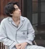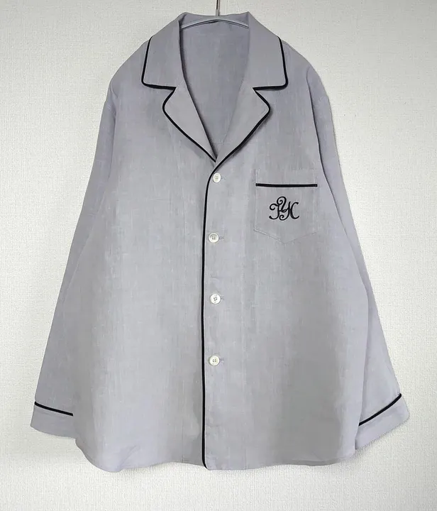 ライトグレーに黒のパイピングでシンプルシックに仕上げたメンズパジャマ。 60番手の細いフレンチリネン糸を高密度に織り上げたハリとコシのある凛とした生地を使用しています。高密度に織った生地はしっかりしているのでお洗濯しても型崩れしません。 縫い合わせはすべて折伏せ縫いになっているので、引っ掛かりがなく、ほつれる心配がありません。ボタンは高瀬貝ボタンを使用。パンツには両サイドに縫い付けのポケットが付いています。 共布の袋は付いておりませんが、旅行用にロゴ入りの巾着袋をお付けしております。 ■メンズパジャマサイズ(平置き寸法) S 着丈65㎝、身幅(胸囲)52㎝、袖丈57㎝、アームホール21㎝、パンツ股下68㎝、パンツヒップ52㎝  M 着丈71㎝、身幅(胸囲)57㎝、袖丈58㎝、アームホール21㎝、パンツ股下70㎝、パンツヒップ55㎝ L 着丈74㎝、身幅(胸囲)60㎝、袖丈62㎝、アームホール23㎝、パンツ股下73㎝、パンツヒップ57㎝