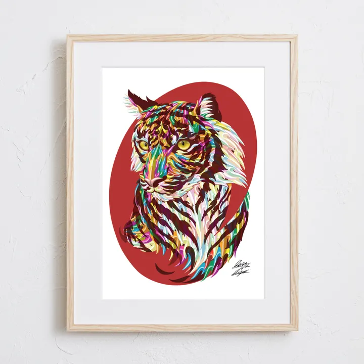 アーティスト -PROFILE- Madblast Hiro(ヒロ) 岐阜県出身。ライブペインター / アーティスト 2021年には大阪府の貝掛中学校の皆様と長さ230mの壁画を制作。 岐阜駅前の繊維問屋街では高さ16mの壁画を制作の他、G-SHOCKやSONY、BETONES等に作品提供を行う。 独自の模様をブロックのように積み上げる表現を突き詰める。 【作品について】 カラフルな色使いはMadblast Hiroの得意とする表現方法の一つ。 躍動的な雰囲気で、見る人を引き込む縁起のよさそうな虎のイラスト 作品名:Mad Tiger 手法:イラスト、デジタル ペーパー:高品質半光沢紙 マットカラー:白 マット*:DXホワイト芯 100%バージンパルプ/PH7・中性紙(2mm厚) ※全てのアートにマットがつきます フレームカラー:黒、白、無垢(3種類から選択) ※マット付のため通常とはフレームサイズが異なる規格となります。 【マット*とは?】 アートポスターの周りに挟んだ厚紙の事。 マットを使わない時に比べ余白により広がりが生まれ、作品の新たな一面を引き出せ作品の見栄えがグッと良くなります。また、額縁のガラス面と作品が直接触れたままにしておくと、くっついて作品を傷つけることがあります。マットを使用することでガラスと作品の間に空間ができ、作品を保護することができます。ブランドコンセプトにより全てのアートにマットがつきます。 ー ファッションのようにアートを ー 私達が掲げるコンセプトです! 毎日着替えるファッションの様に、アートも気軽に飾り変えて欲しい... 一旦飾り終えたアートにも光を当ててほしい... ポスター単体、またはリピートで中身だけのポスターを購入された方に"専用のハンガー"をセットでお届け。 「今までに無い!新しいアートの飾り方を提案」 飾る事がなくなった前のアートをハンガーにかけて洋服と一緒にかけてもらう。 その日の気分や、モチベーションですぐに取り換えられる様に。 もちろん、魅せる収納としても今までにないおすすめの飾り方です。