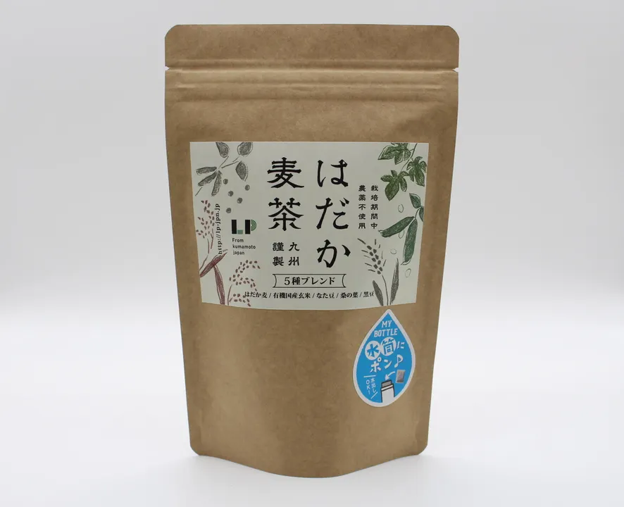国産有機玄米の香ばしい香り!!ギフトにも最適!! 様々な風味が楽しめる、5種ブレンド麦茶です。 マイボトル(水筒)にぴったりの新サイズ!! お仕事やレジャー、部活動など幅広くご利用いただける水出し/お湯出し両用の新商品です。(ティーパック入り)少量で作れるから、小さなお子さまにもおすすめです。 九州産「はだか麦茶」に、国産有機玄米が更に香ばしさを引き立てた味わい。 そのほか、なた豆、桑の葉、黒豆もブレンド。 ホットでも、美味しく愉しめる一品となっております。 [特徴] 素材:農薬不使用もしくは有機JASのみ 手軽な水筒サイズ   水出し/お湯出し可         ノンカフェイン     ティーバッグ 【カラダとお財布にやさしい、ちょうど半月で使い切りの便利なサイズです。】 水出し/お湯出し可能なティーパック入りで便利。500mlがわずか27.6円で作れます。(お湯出しで作成した場合) 学校や職場で作れば、部活や外出時に重宝します。目安:1ティーバッグにつき、水出し;500ml お湯出し:750ml 【豊かな大地に育まれたはだか麦茶】 世界農業遺産として認定を受けた阿蘇を含め、全国を代表する「農業大国 九州」で生産された 化学肥料/農薬不使用の“はだか麦”だけを使用致しました。 【豊かな水資源で育ちました】 飲料メーカーも採水、工場を設ける「水の国 九州」。 県内各所に湧水が見られる熊本や阿蘇山を水源とした一級河川、筑後川に育まれた原材料を使用しています。 【はだか麦茶の安全性について】 安心安全の化学肥料/農薬不使用の“はだか麦”のみで生産致しました。 ※①ポストハーベスト農薬の影響が無い、化学肥料/農薬不使用の、安全な“はだか麦”を使用した昔ながらの味わいをぜひお試し下さい。 (※①ポストハーベスト農薬・・長時間の輸送や保管時の病害虫被害を防ぐために散布される、収穫後に使用される農薬のこと) 放射能測定について原材料の“はだか麦”は第三者機関において放射能測定検査を実施し、放射能セシウムは検出されませんでした。 【ミネラル豊富・カフェインレス、水出しOK】 安心・安全・カフェインもゼロで赤ちゃん・子どもをお持ちの方、妊婦の方にも、ご家庭での水分補給として大変喜ばれています。 まろやかで優しい味わいの麦茶です。 水出しで手軽に作れるので、ご家庭でも喜ばれています。 商品製造の一部行程は、障がいを持った人たちが働く、食品衛生許可を得た、就労支援事業所の協力を得て、製造をしています。例えば、「はだか麦茶シリーズ」のシール貼りや割印は、すべて手作業にて1枚1枚丁寧に仕上げています。すべて手作業のため、一度に大量の作業は出来ませんが、シール貼りが好きな人、割印を押すのが好きな人、封入作業が好きな人など・・それぞれ楽しんで、作業をしてもらっています。 ■お客様の声 * 2017年2月 K様 そろそろ麦茶を準備しておかなきゃ…と考えていた所、LPさんのサイトに出会いました。無農薬ということで、安心できると感じて購入しました。まずは味見を…と思い飲んでみたところ、とても優しく、イガイガしないのでとても飲みやすく、これなら娘にも飲ませられる!と思いました。思ったとおり、娘も喜んで飲んでくれているようです。今後ともどうぞよろしくお願い致します!!私もホット麦茶として愛飲中です。 * 2016年11月 M様 知人に紹介してもらい、以来家族で飲んでいます。他の麦茶に比べるとスッキリした感じが気に入っています。また、無農薬ということで子どもにも安心して飲ませられます。あとパッケージが可愛いのも気に入っています。