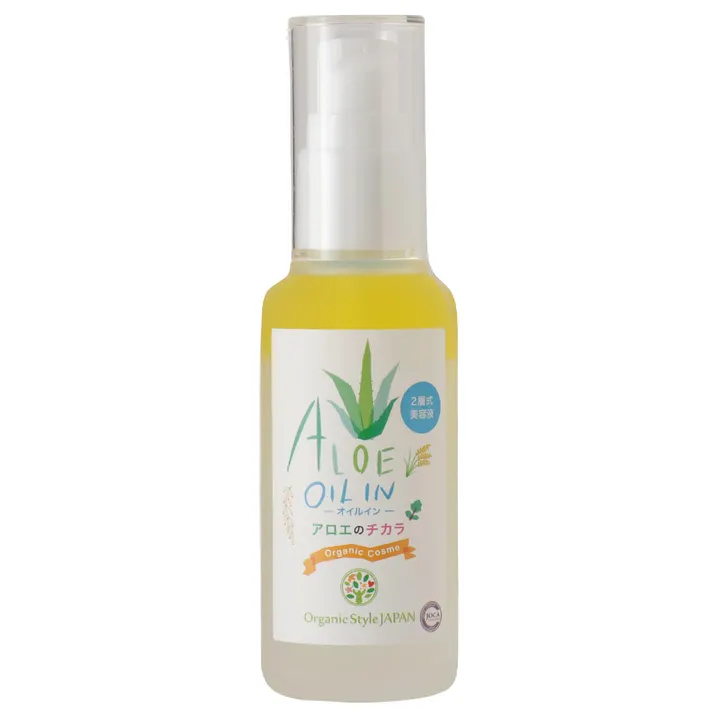 界面活性剤を使用していないため、お使いになる前に振って使う2層式美容液です (油分:水分 2:8で調整) しっとりするのにべたつかない使い心地 乾燥が気になるときはローションの前に使い、そのあとにローション、再びオイルインをなじませるとよりしっとりします 男性にはアフターシェービングローションとしてもお使いいただけます 肌で悩む人の力になりたいという思いからうまれたアロエのチカラ、 使っている植物はすべてオーガニック、 農園から製造まで化学合成成分フリーでつくっているから肌が弱い方、敏感な方にもお使いいただけます ●オイルイン ・自然由来指数100% ・オーガニック認証取得植物配合率97.3% (認証取得植物以外も自然栽培) オイルインは宮古島のアロエベラを50%配合! アロエベラの優れた効果は古代エジプトの文献にも記されていて、クレオパトラが美肌のために使っていたとされています 肌トラブルと年齢肌に働きかける5種類のオーガニックオイルと10種類の美容植物を配合! アロエベラやシマ月桃は肌の酸化防止はもちろん、抗炎症、シミの予防、肌のリカバリー、抗炎症の高いソメイヨシノ葉やカレンデュラ、保湿や抗菌、肌のバリア機能を高めるヤブツバキ油、CICAコスメにも使われているツボクサなど肌に有効な植物を厳選 防腐は静菌、防腐効果のあるセイヨウシロヤナギ樹皮エキスとローズマリーなどの植物の相乗効果で実現しています ※アロエのチカラはアロエベラの外皮を除去して加工しているため、アロイン、ヒドロキシアントラセン誘導体を含みません