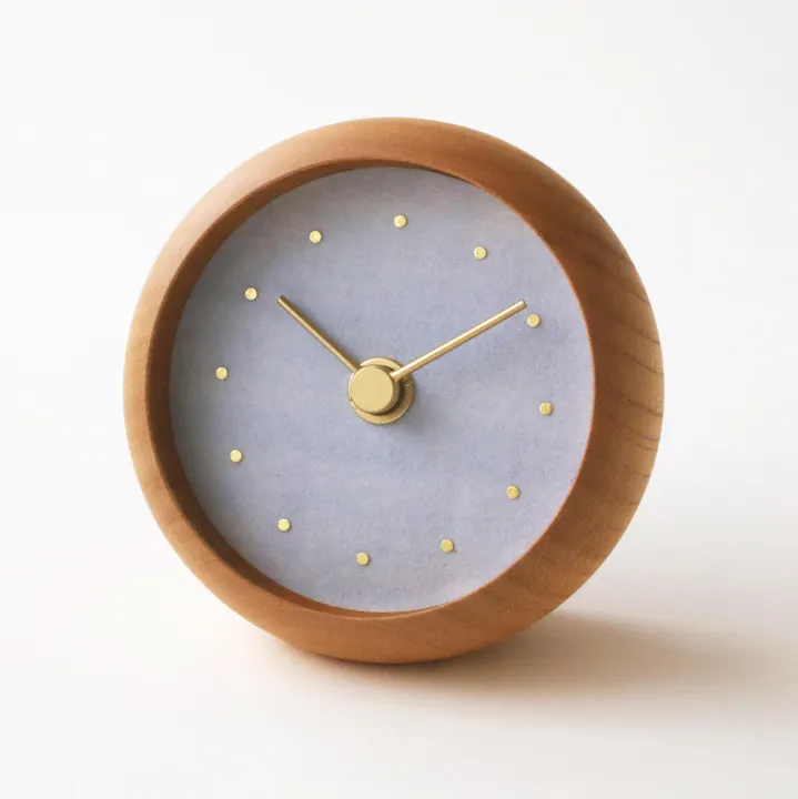 文字盤にソーダライトを砕いた粉末(岩絵具)を塗りました。 普通の絵具では出せない透明感のあるやさしい色彩とザラザラした岩絵具特有の質感をお楽しみ下さい。 本体は、漆器の産地として400年以上の歴史を持つ石川県加賀山中の「ろくろ引き」という、回転する木に鉋(カンナ)を当てて形作る方法で製作しました。 素材はケヤキで、木目が美しく、なめらかでしっとりとした質感です。 文字盤は、下地に金沢市二俣町で和紙作りをされている、石川まゆみさんに漉いていただいた和紙を使用し、 その上に天然石を砕いて作られる「岩絵具」を幾重にも塗り重ねています。インデックスは金沢の金箔です。 ■木の部分の色は、プレーン・ブラウン・ブラックの三色をご用意しております。 ■裏面カバーにオリジナルの刻印を入れることができます。(有料 +880円税込) ■受注生産のため、基本的にご注文いただいてから約2週間のお時間をいただきます。ご了承ください。 【時計部分の仕様】 ・日本製・1年保証・本体のサイズ:直径10cm厚さ5.4cm・使用電池:単3形乾電池 【付属品】 ・単3乾電池1個・取扱説明書1部・牛革製裏面カバー