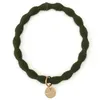 毛量が多く、ソフトにしっかり結びたい方のためのヘアゴム 「カーキグリーン」は実り多く、うつろいゆく季節を感じる、深みのあるカラー。コートなどの色と揃えてまとめたい時にも。 ポコポコ部分が髪をキャッチしてくれるので、滑りにくく、しっかり髪を結べます。結んだ時にキツくなりすぎないため、つけていて痛くなりにくいのも特長です。ポニーテール時や、アンニュイヘアで髪を引き出したときにも崩れにくいので、ぜひ試してみてください。 オリジナルチャーム付きなので、手首につけても素敵にキラリ。うっかり机に置き忘れてもひと目で自分のものと分かります。 1本1本、手作業でゴムリングの接着加工をしています。金属のパーツでゴムをかしめているヘアゴムの場合は、髪の毛が引っかかると切れてしまいますが、当社の製品は、つなぎ目がほとんど分からず、髪の毛にも優しいです。 直径:約50mm、太さ:約3~5mm、プレートの直径:約8mm 材質:ナイロン・天然ゴム・真鍮