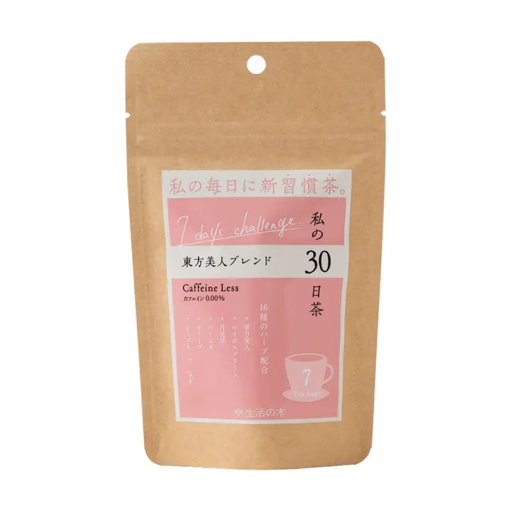 心と体に気持ち良い習慣を始めていただくための「私の30日茶」です。 日々の生活の中で無理なく、美味しく、楽しみながら飲み続けられるよう、とにかく美味しさにこだわりました。 ゴクゴク飲めて、身体に染みわたるようなブレンドに仕上げています。 東方美人ブレンドには東方美人やルイボスグリーン、月見草など16種類のハーブを配合しています。 上品な甘い余韻を感じる東方美人をベースに、ハーバルですっきりした飲み口が特徴。 【7ティーバッグ】 1週間のお試し用に。 袋のトップに穴があいておりフック陳列が可能。 個包装タイプではありません。 【30ティーバッグ】 まずは30日召し上がっていただくために。 携帯に便利な個包装タイプなので、オフィスや旅行先への持ち運びにも。 【90ティーバッグ】 しっかり3ヶ月間継続的に飲用していただくために。 1日に数回召し上がる方や、家族やオフィスのみんなで飲む場合にも便利です。 個包装タイプではありません。