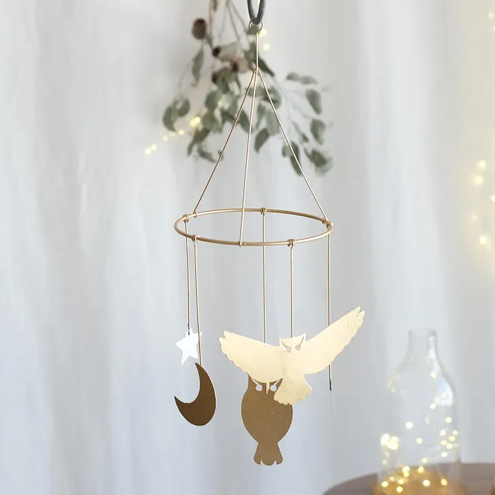 幸運を呼ぶ吉鳥といわれるフクロウをモチーフにしたブリキのモビール。 壁や天井のフックなどにかけたり吊るしてお使いいただけます。 クリスマス以外に季節問わず1年中ご使用いただけるアイテムで、子供部屋の飾りにもぴったり。 モビールはベッドメリーのように赤ちゃんのベッドの上に飾るのもオススメです。 風や人の動きでゆらゆら揺れるモビールの動きは赤ちゃんの知的好奇心を刺激し、豊かな情緒をはぐくんでくれます。 ※赤ちゃんの手に届く高さではご使用にならないようにしてください。